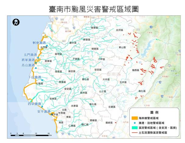 因應鳳凰颱風警報之各項災害應變事項,臺南市政府公告劃定「本市海岸線、溪流、土石流地區及漁港泊地等警戒區域」(如附件),為限制或禁止人民進入或命其離去之範圍,特予公告。