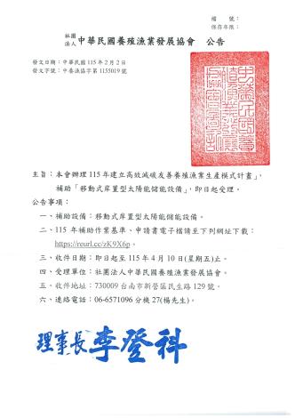 社團法人中華民國養殖漁業發展協會執行115年建立高效減碳友善養殖漁業生產模式計畫–「移動式岸置型太陽能儲能設備」補助申請案,即日起受理,請有需求的養殖漁民盡快申請。